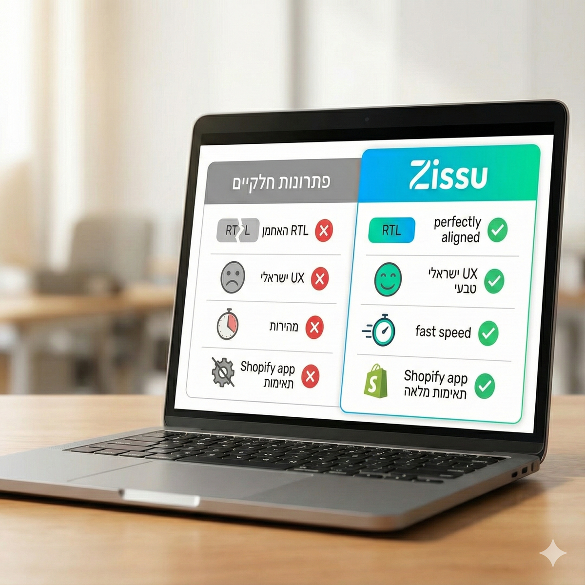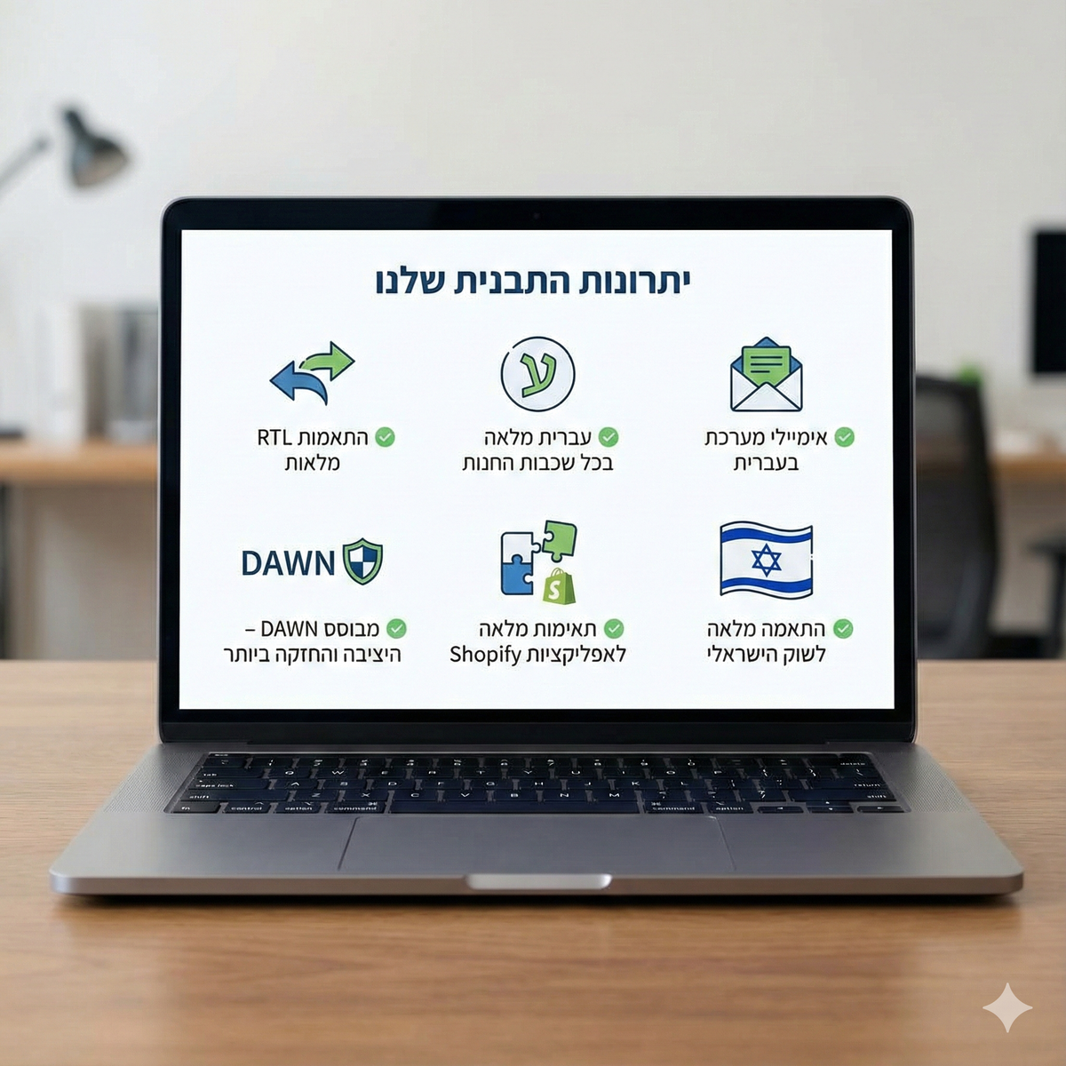 התאמות RTL מלאות, עברית מלאה בכל שכבות החנות, אימיילי מערכת בעברית, מבוסס DAWN – היציבה והחזקה ביותר של Shopify, תאימות מלאה לאפליקציות Shopify, התאמה מלאה לשוק הישראלי.