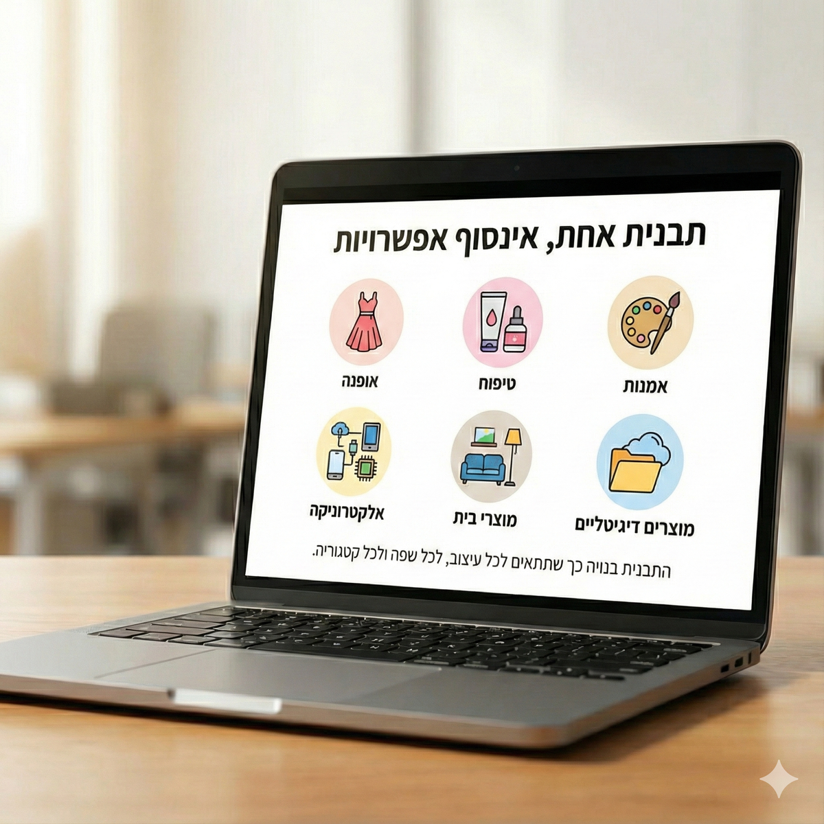 אופנה | טיפוח | אמנות | אלקטרוניקה | מוצרי בית | מוצרים דיגיטליים. התבנית בנויה כך שתתאים לכל עיצוב, לכל שפה ולכל קטגוריה.